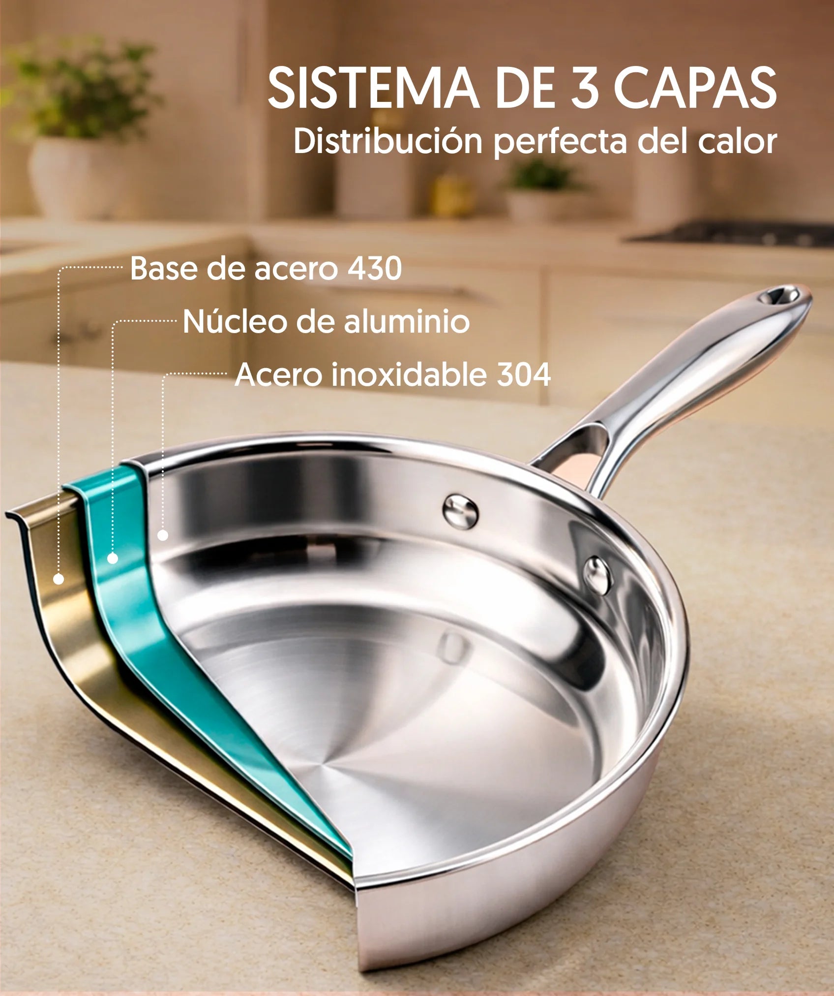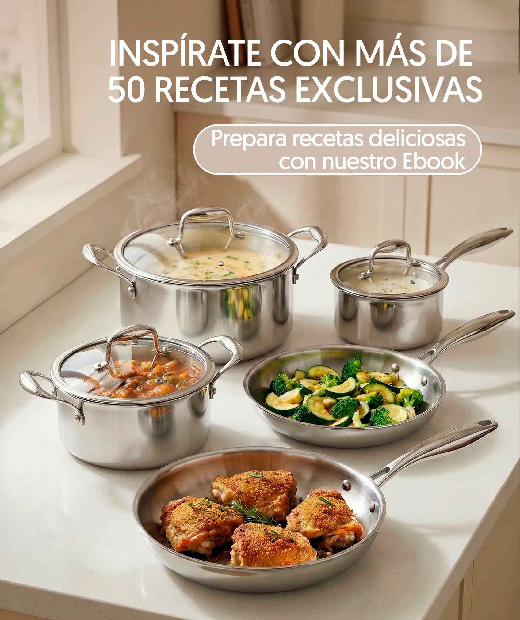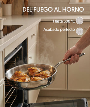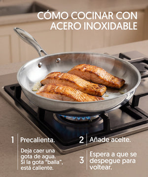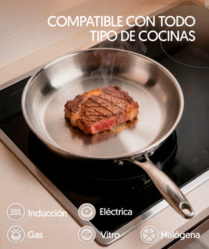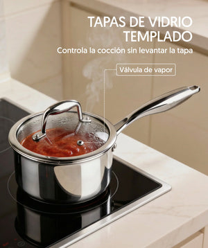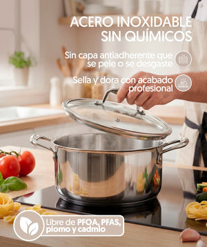 Fabricado en acero inoxidable de alta calidad, este set tiene 3 capas que garantizan una distribución uniforme del calor para una cocción más eficiente. Sin recubrimientos, lo que asegura una cocción saludable y duradera, ideal para quienes prefieren evitar químicos en su cocina. Incluye un eBook con 50 recetas exclusivas.