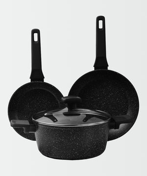 La batería de cocina incluye 2 sartenes de Ø 20 cm (altura 4,3 cm; volumen 1 litro) y Ø 24 cm (altura 4,8 cm; volumen 1,7 litros), 1 olla de Ø 24 cm (altura 10,5 cm; volumen 4,1 litros) y 1 tapa de vidrio templado, perfectas para superar todas las expectativas culinarias.