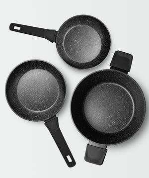 Nuestra batería es apta para todo tipo de cocinas, incluidas inducción, gas, placa eléctrica y vitrocerámica, lo que garantiza un rendimiento óptimo en todos los fuegos. También se encuentra libre de PFOA, PFOS, plomo y cadmio.