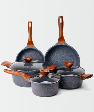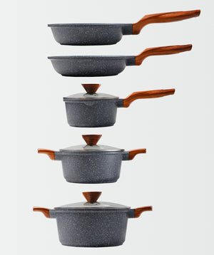 Nuestra batería es apta para todo tipo de cocinas, incluidas inducción, gas, placa eléctrica y vitrocerámica, lo que garantiza un rendimiento óptimo en todos los fuegos. También se encuentra libre de PFOA, PFOS, plomo y cadmio.