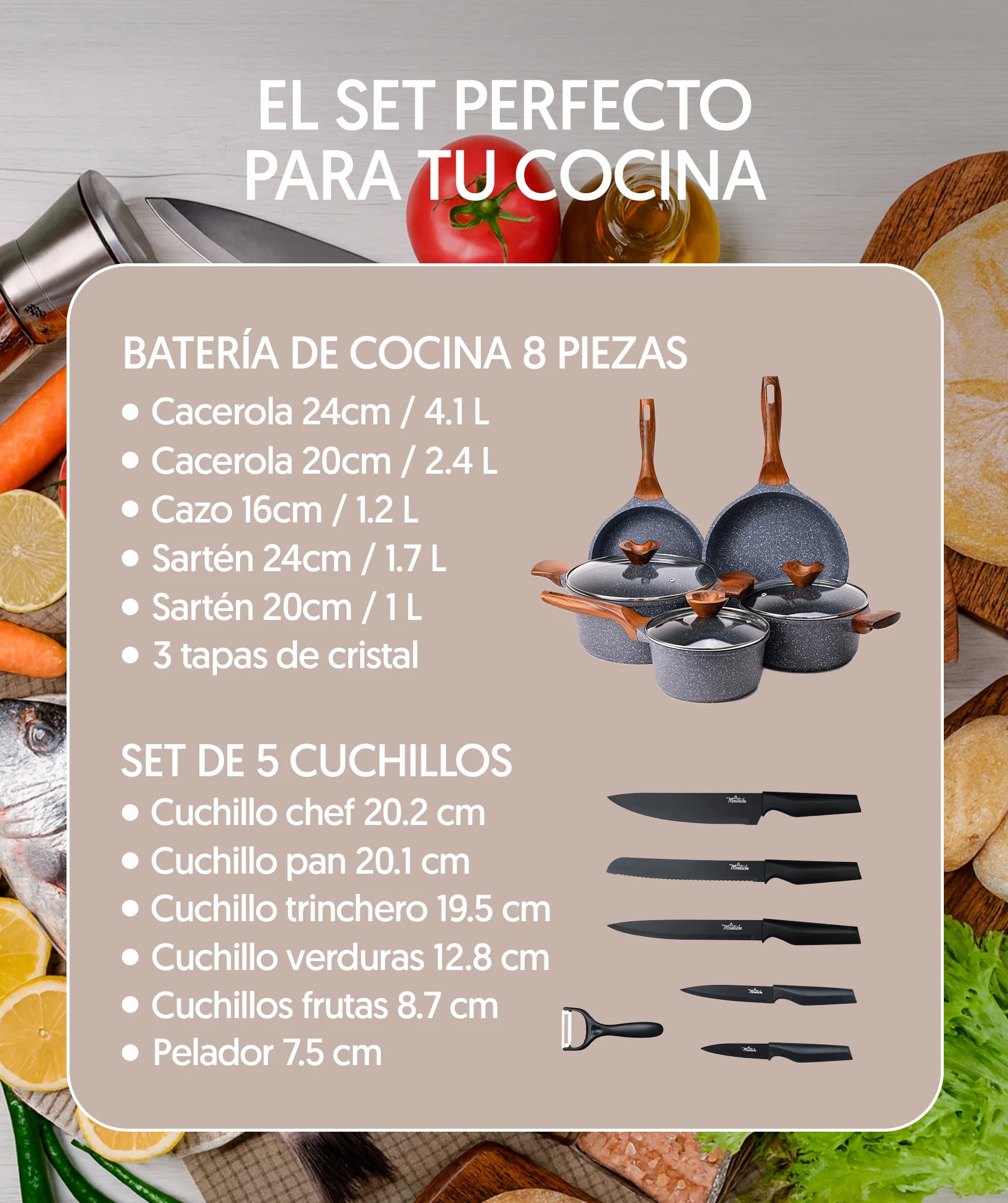 La batería es apta para todo tipo de cocinas: inducción, gas, eléctrica y vitrocerámica. También se encuentra libre de PFOA, PFOS, plomo y cadmio. Mientras que los cuchillos profesionales exhiben ligereza para adaptarse tanto a principiantes como a expertos en la materia.