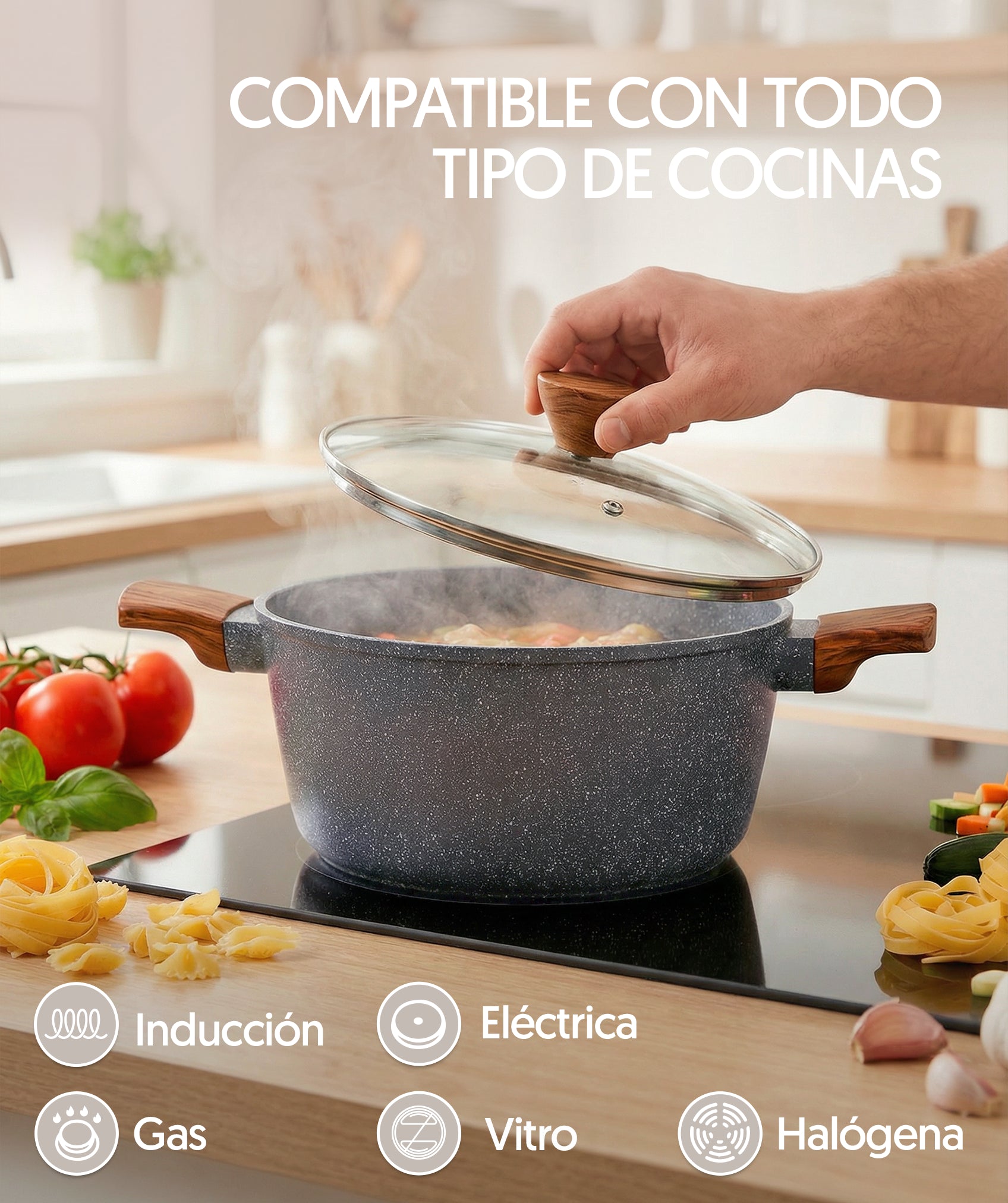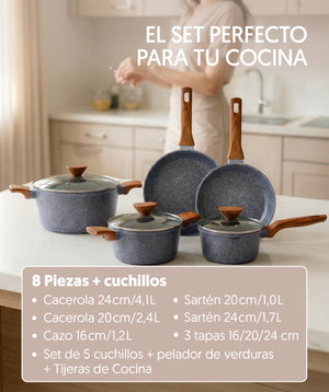 La batería es apta para todo tipo de cocinas: inducción, gas, eléctrica y vitrocerámica. También se encuentra libre de PFOA, PFOS, plomo y cadmio. Mientras que los cuchillos profesionales exhiben ligereza para adaptarse tanto a principiantes como a expertos en la materia.