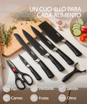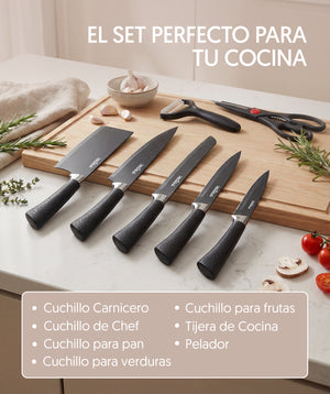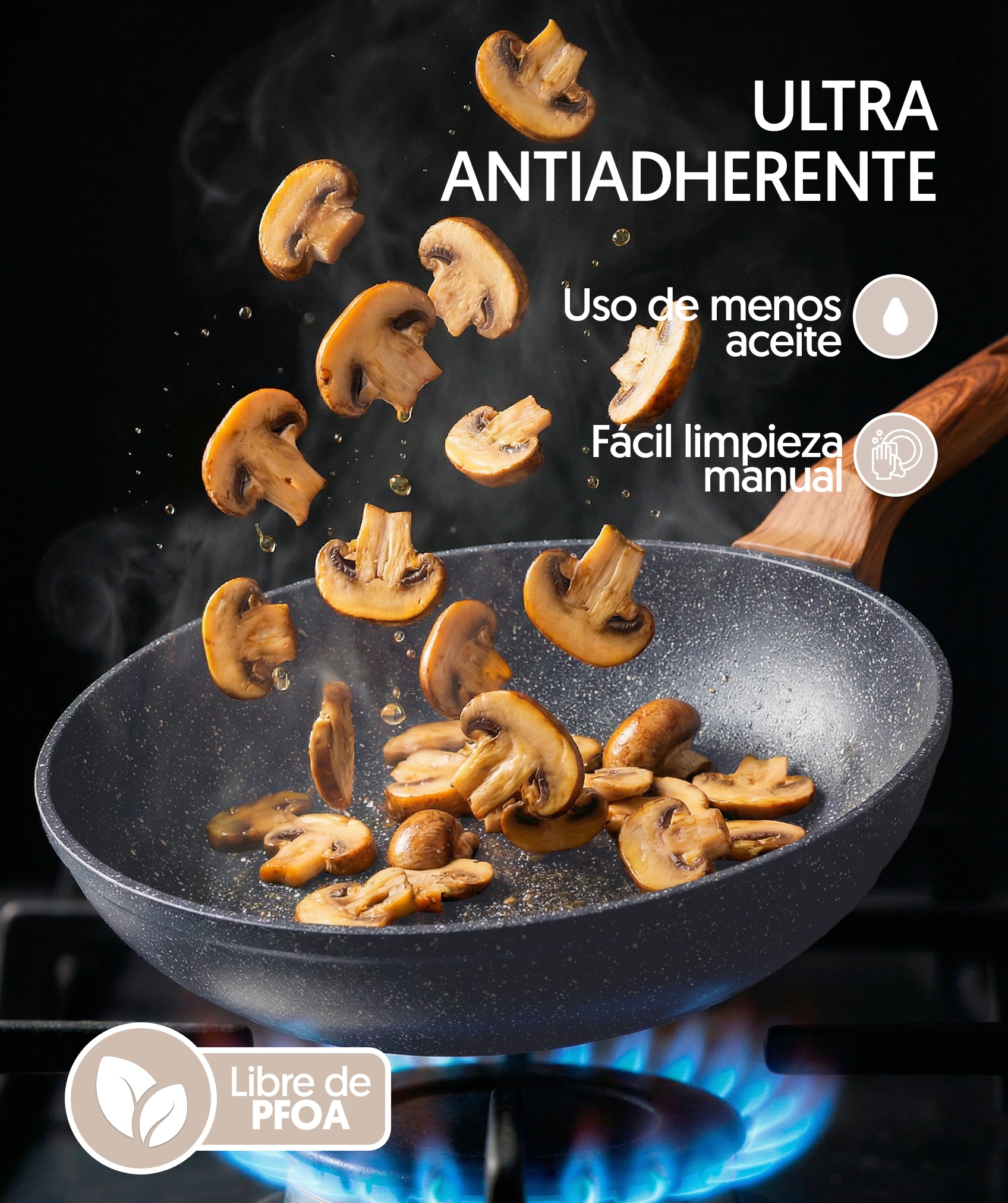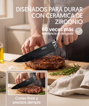 El tiempo de vida útil de la batería de cocina es amplio por la presencia de una capa de partículas minerales reforzada. A la par, el juego de cuchillos tiene un afilado de prolongada utilidad que permite realizar cortes rápidos y precisos.【Consejo de limpieza】Se recomienda lavar a mano con jabón neutro —y no en el lavavajillas— para maximizar la durabilidad del set.