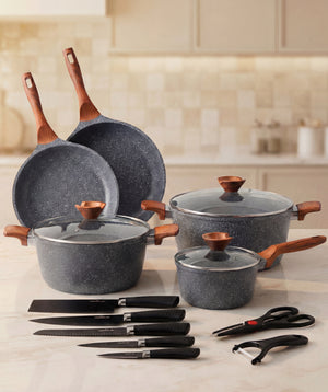 Todas las piezas presentan alta resistencia y evitan la adhesión de grasa. La batería, que es de aluminio, incluye 2 sartenes de Ø 20 cm (altura 5,3 cm; volumen 1,1 litros) y Ø 24 cm (altura 5,5 cm; volumen 1,8 litros); además de 3 ollas de Ø 18 cm (altura 8,5 cm; volumen 1,85 litros), Ø 20 cm (altura 9,5 cm; volumen 2,45 litros) y Ø 24 cm (altura 11,5 cm; volumen 4,2 litros) con 3 tapas de vidrio. A su vez, el juego de 5 cuchillos más pelador de verduras y tijeras es inoxidable.