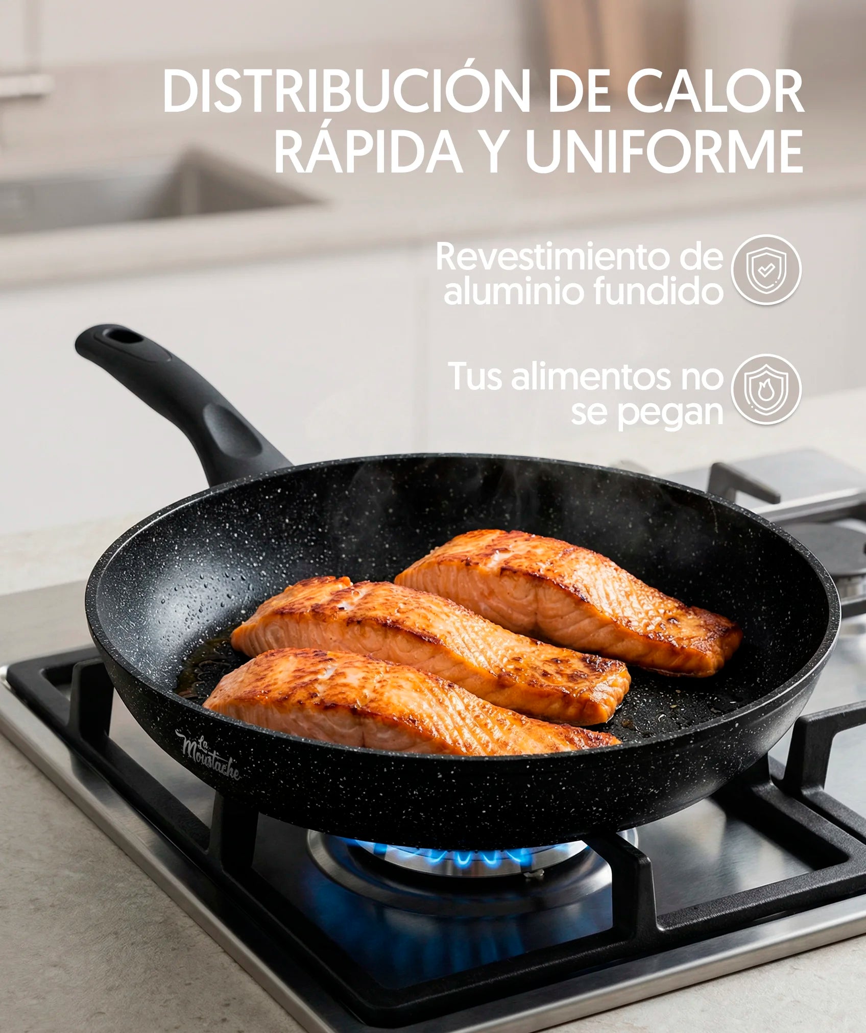 Cada pieza es de aluminio fundido ―que permite una distribución uniforme del calor― junto con un revestimiento antiadherente para evitar la presencia de grasa acumulada. Una combinación que confiere resistencia a las altas temperaturas, la corrosión, los arañazos y los golpes.