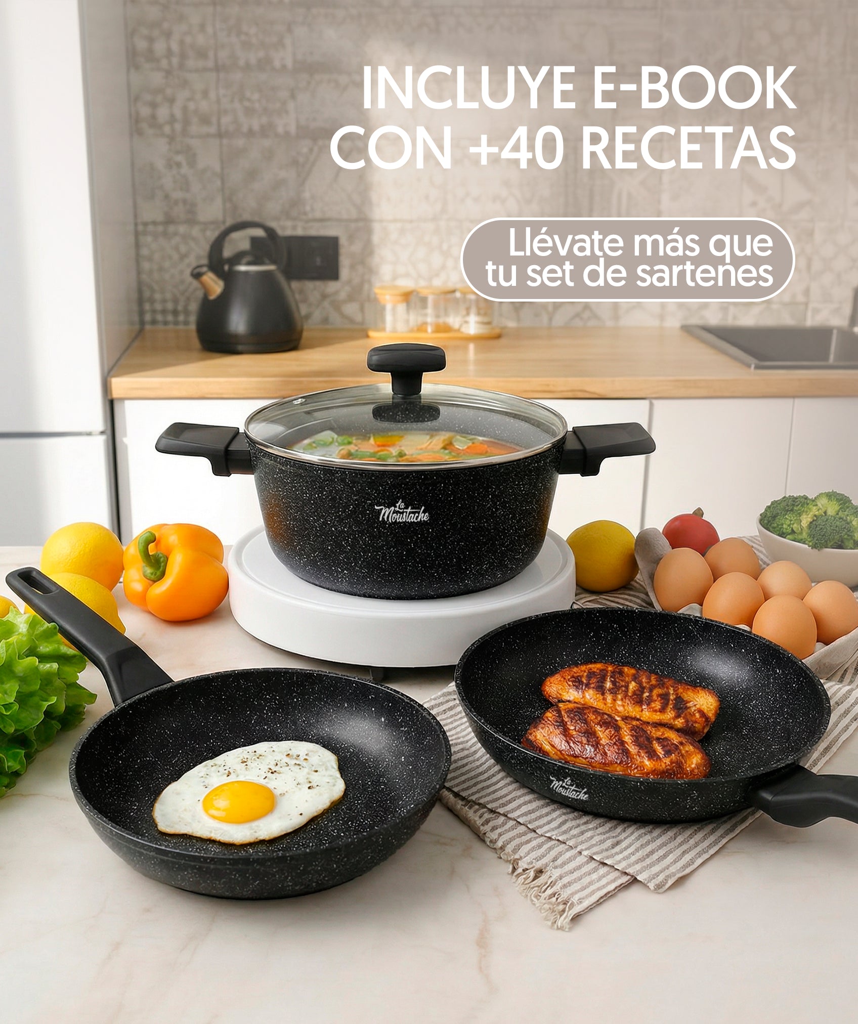 El conjunto incluye tapas en vidrio templado con válvulas pensadas para la salida del vapor, lo que favorece una cocción ideal de los alimentos, sin importar que los platillos estén a cargo de chefs o principiantes.