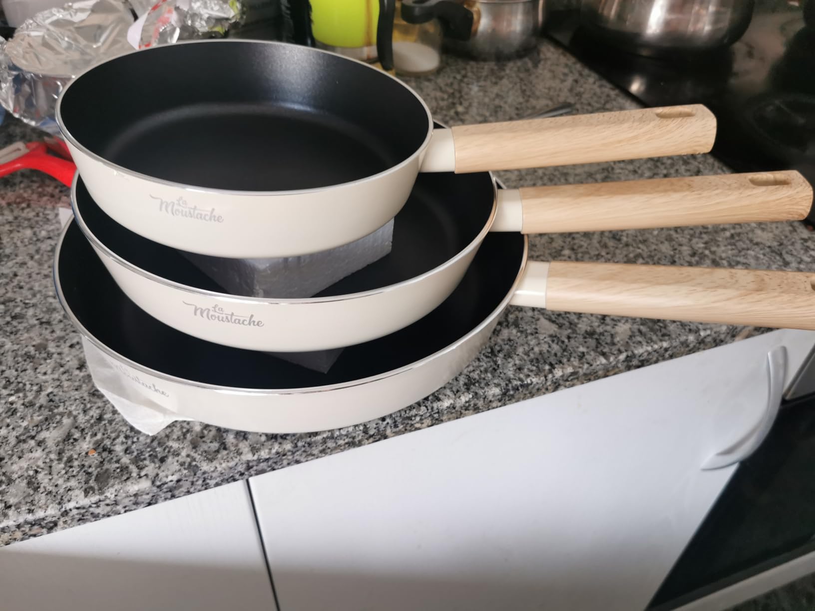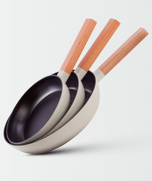 Juego de sartenes perfecto para freír o saltear de manera rápida y uniforme, gracias a su diseño equilibrado que descarta el riesgo de puntos calientes y cocciones desiguales.
