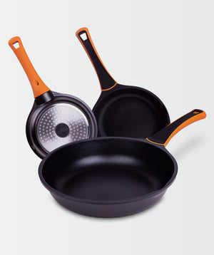 Juego de sartenes perfecto para freír o saltear de manera rápida y uniforme, gracias a su diseño equilibrado que descarta el riesgo de puntos calientes y cocciones desiguales.