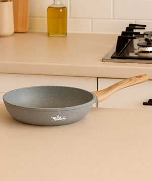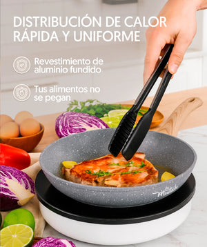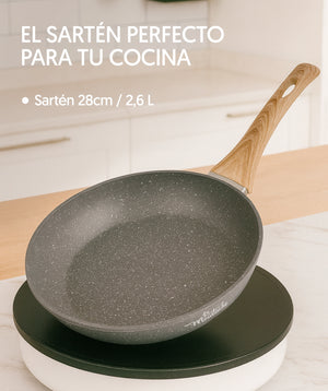 Sartén antiadherente, libre de PFOA, resistente a los arañazos y a numerosos tipos desgaste, lo que prolonga su vida útil.