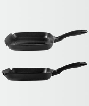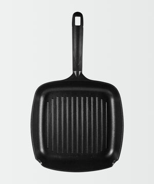 Grill asador con rayas fabricado con materiales que impiden la adhesión de alimentos a la superficie, mostrando notable resistencia a la corrosión y a las altas temperaturas con una base interior de acero inoxidable.