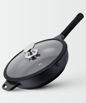 Incorpora una tapa de vidrio templado con orificio de salida de vapor y un mango ergonómico con rejilla de silicona, ideales para cocinar de manera fácil, cómoda y precisa.